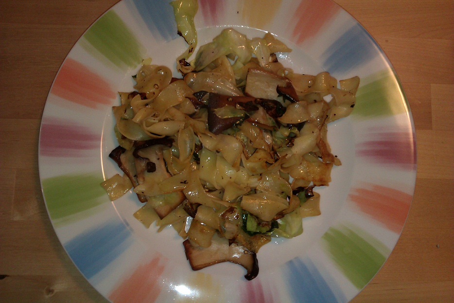 Die Zubereitung ähnelte dem Krautnudeln-Rezept (heißt es bei uns), das wir ab und an mal kochen. Die Kräuterseitlinge waren neu für mich. Leider musste ich sie ersetzen, denn ich konnte keine auftreiben. Ich habe braune Champignons verwendet, die wahrscheinlich nicht so aromatisch waren.