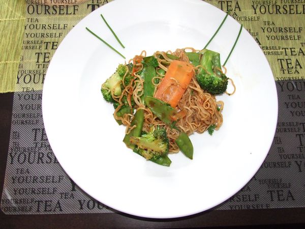 Was man auch beherzigen sollte, ist dass man nach der zweiten Zugabe der Soja-Honigsosse (den Sherry habe ich weggelassen weil ich keinen dahabe) sofort servieren soll. Die Nudeln saugen ziemlich schnell alle Flüssigkeit auf und es würde sonst eher trocken.