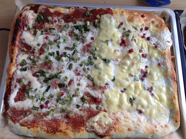 Da ich einen Thermomix zur Verfügung habe, musste ich mich nicht an die Angaben bezüglich der Zubereitung halten. Ich habe einfach alle Zutaten erst für den Teig, dann für die Tomatenpampe reingeworfen und das Ergebnis war hinterher super. Den Teig konnte ich sehr leicht entfernen, weil er gar nicht klebrig war. Auch der Tomatenbrei sah sehr gut aus. Nach ca. 2 Stunden Gehzeit habe ich dann den Teig auf 2 Blechen ausgerollt, ihn mit Tomate bestrichen und dann die Saura Sahne drauf gemacht. Anschließend habe ich den Lauch drübergestreut und noch ein paar Schinkenwürfelchen. Ein halbes Blech habe ich ohne Tomate gemacht, weil ich das nicht so gern mag. Der Rest war aber gleich. Dann ging das Ganze ab in den Ofen.