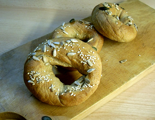 Ich habe heute auch mal wieder was aus dem Buch gebacken, und zwar die Vollkornbagels von S. 65.
