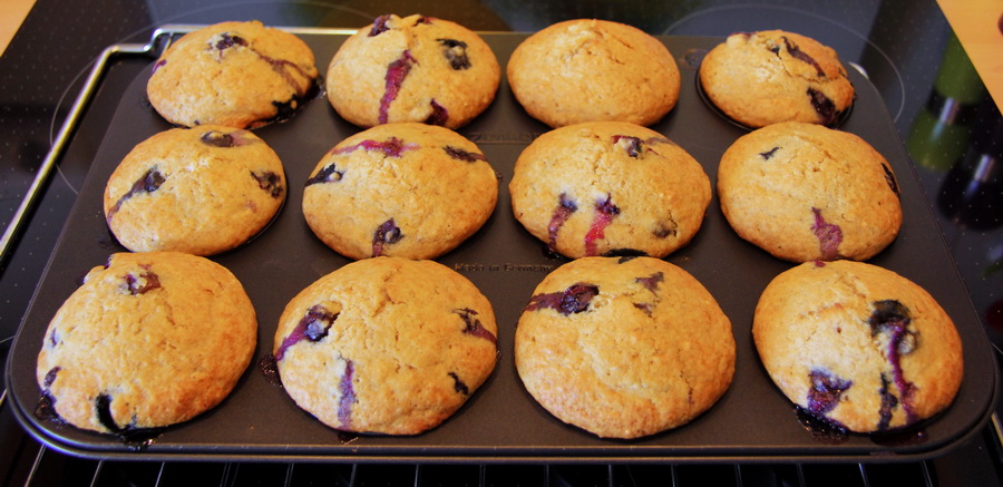 Änderungen: statt dem Ahornsirup habe ich Honig genommen, sonst alles nach Rezept. Allerdings habe ich die Muffinform nicht ausgebuttert sondern Papierförmchen reingesetzt. Der fertige Teig schin mir viel zuviel für 12 Muffins, so habe ich die Form wie gewöhnlich mit 3/4 Teig gefüllt und den restlichen Teig zurückbehalten. Die Muffins sind dann aber nicht so stark aufgegangen, so dass ich vermutlich den ganzen Teig in 12 Förmchen hätte füllen können. Beim zweiten Blech habe ich dann mehr reingetan, sieht man dann auf dem Foto.