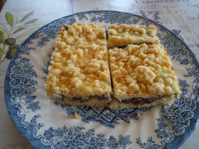 Gestern habe ich einen Kuchen gebacken der ist fast weg, gerade das ich noch den Rest knipsen konnte. Hefeteig darauf eine Mischung aus etwas Griesbrei, Quark, Mohn mit Rosinen und klein geschnittene Äpfel. Darüber Zimtstreußel. Das erinnerte mich so an die Kuchen meiner Oma.