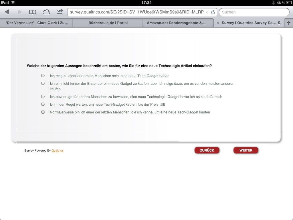 In den letzten zwei Wochen habe ich mir Kindle-Seiten bei Amazon angeschaut. Das war offenbar für Amazon ein Auslöser, mich zu einer Befragung einzuladen. Und ich habe mitgemacht. Mit Freude. Also zumindest so lange, bis mich die sprachlich ausgefeilten Fragen auf einer Seite so in Entzücken versetzt haben, dass ich nicht mehr zu einer der ersten Menschen sein mag. ![]()