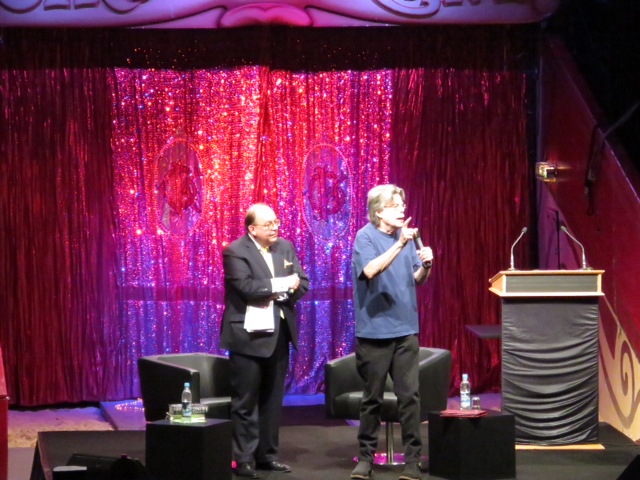 Er las den Beginn von "Doctor Sleep" auf Englisch (vom iPad, über das er herzhaft fluchte), weil das den Vorteil hat, dass man nicht in Handlung einführen müsse. Später erzählte er, dass Leser oft fänden, dass dieser Roman nicht so gut sei wie seine früheren, das liege aber daran, dass diese Leute seine Romane mit 14 unter der Bettdecke mit schlotternden Knien gelesen hätten und sie jetzt einfach vierzig Jahre älter und weniger leicht zu beeindrucken wären.