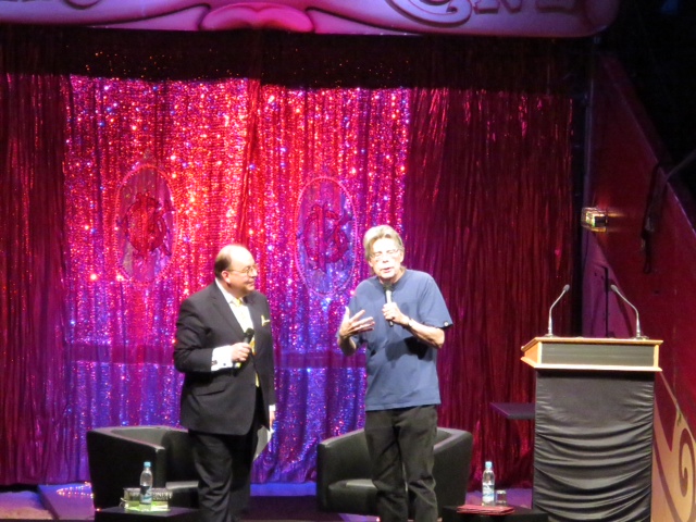 Es folgten noch drei Fragen, die Leser über Facebook gestellt hatten. Aus dem Laden Needful Things würde er das Kissen von H.P. Lovecraft wollen, um zu sehen, ob noch Träume darin wären, die er stehlen könne. Und er würde jemanden, der noch kein Buch von ihm gelesen hätte, empfehlen, einfach alle Bücher zu kaufen, dann würde derjenige bestimmt etwas finden, was ihm gefallen würde. Und auf die Frage nach traumatischen Erlebnisse in seiner Kindheit erklärte er spitzbübisch, wenn er welche gehabt hätte, wären diese in seinem Unterbewusstsein verschwunden. Andere Menschen würden Psychatern eine Menge Geld für die Therapie zahlen und er würde eine Menge Geld dafür bekommen, darüber zu Schreiben.
