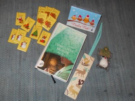 Bekommen habe ich das Buch "Blogging Queen" von Jutta Profijt. Außerdem einen obercoolen Nichtlustig-Notizzettel-Block mit Lemmingen drauf (ich liiiiiiiebe die Lemminge!!!!!!), einen Eulen-Fotohalter, selbstgebackene Kekse (mein Freund bestätigte schon, dass sie sehr lecker sind :lache), Rentier-Gummitiere, eine kleine Tafel Schokolade mit nem Schneemann drauf, und eine sehr hübsche Karte.