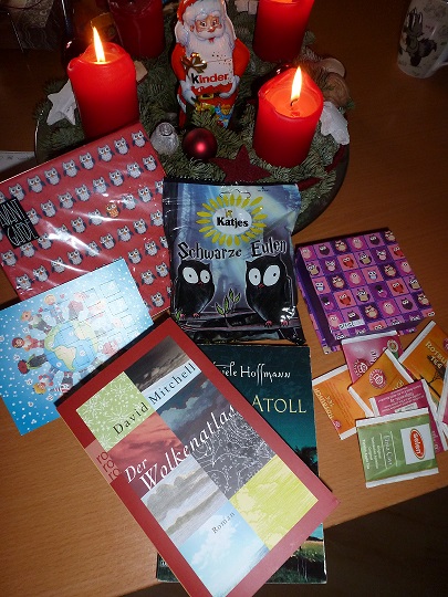Bekommen habe ich das Buch "Blogging Queen" von Jutta Profijt. Außerdem einen obercoolen Nichtlustig-Notizzettel-Block mit Lemmingen drauf (ich liiiiiiiebe die Lemminge!!!!!!), einen Eulen-Fotohalter, selbstgebackene Kekse (mein Freund bestätigte schon, dass sie sehr lecker sind :lache), Rentier-Gummitiere, eine kleine Tafel Schokolade mit nem Schneemann drauf, und eine sehr hübsche Karte.