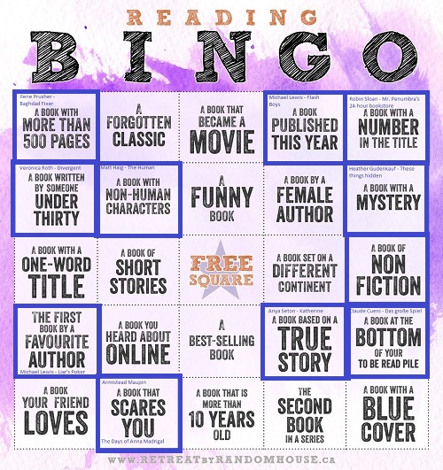 Ich dachte, dass das "free square" ein Joker-Feld ist, das aber trotzdem mit (irgend)einem Buch gefüllt muss. Sonst hat man doch Bingo-Reihen mit nur 4 Büchern und andere mit 5?