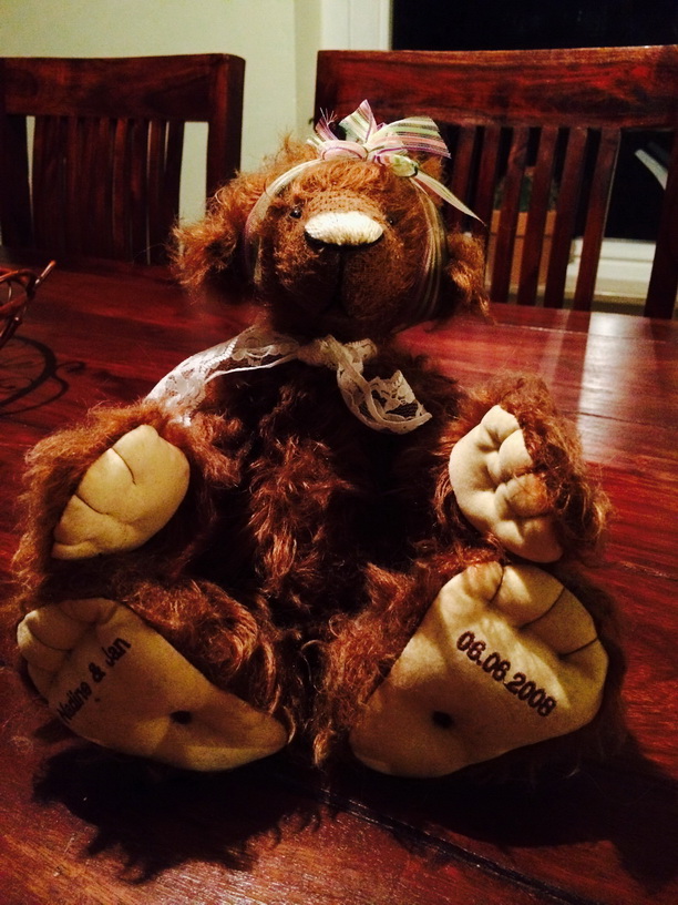 @ Gucci: Als ich damals hörte, dass sie Bären macht, war ich nicht sehr beeindruckt. Dann war sie an einem Stand und hat verkauft und ich habe mich sofort in einen verliebt. Den hat sie mir dann geschenkt. Den vom Foto haben wir zur Hochzeit bekommen, daher hat er auch so ein Schleifchen im Haar. Der andere ist ohne Schnickschnack ![]()