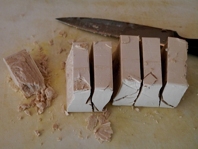 Neeee, da ich ja die Hefe direkt vom Bäcker hole, ist sie total billig. Nur eben ein Riesenblock: 454 g für etwas über 1 Euro. Nun ja, da könnte ich die Krümel auch eben in den Müll schmeissen, kosten ja nicht die Welt, aber das mach ich doch nicht so gerne.