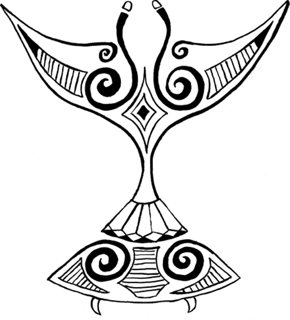 Das Motiv habe ich selbst entworfen. Ich habe mir den Gründungsmythos der Rochenkinder ganz am Anfang ausgedacht und dann überlegt, wie ich den Rochen und den Vulkan zusammenbringen kann. Stilistisch lehnt sich das Motiv an Südseetätowierungen an, insbesondere denen von den Menschen der Marquesas-Inseln.