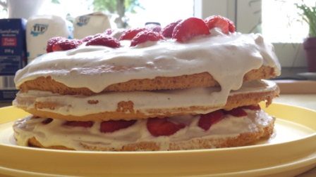 Ebenfalls nach Vorgabe. Allerdings ist der Biskuitteig, so wie beschrieben, echt nicht gut geworden. Nicht ein bisschen locker flockig. Nächstes Mal werde ich die Eier die nicht trennen, sondern gemeinsam mit dem Zucker schaumig/cremig rühren. Funktioniert eindeutig besser und ist locker flockig.