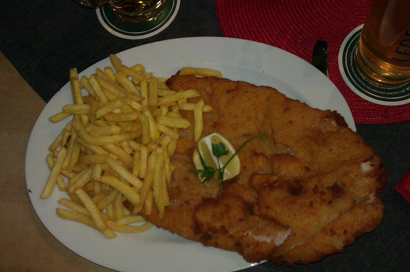 Das Schnitzel war gar nicht soooooo groß, das wirkt nur so neben den winzigen Pommes