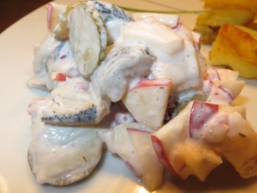Verwendet habe ich Bismarkheringe aus dem Glas und Sauerrahm, alles andere wie im Rezept angegeben.