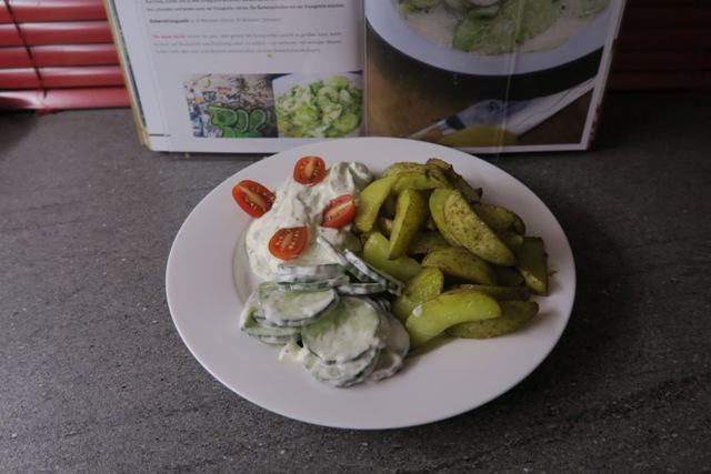 Rahmiger Gurkensalat S. 184 und Kräuterquark zu Pellkartoffeln S. 46 (die sich in Kartoffelspalten verwandelt haben)