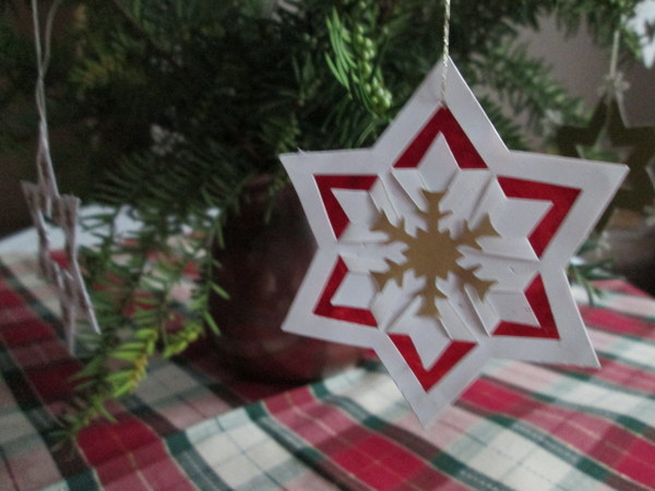 Ich habe zur Zeit noch Tannenzweige in einer Vase, an denen selbstgebastelte Sterne hängen. Mein Baum wird in der kommenden Woche aufgestellt. Der wird dann mit roten und goldenen Kugeln und Glöckchen geschmückt.