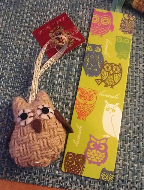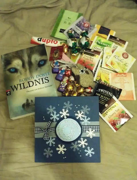 Drin waren: Schokolade in diversen Formen (Kugeln, Nikoläuse, Duplo, Yogurette etc.), ganz viel Tee (uiii ich mag Tee! :kiss ), eine kleine Stoff-Eule, ein wunderschönes Eulen-Lesezeichen mit Gummiband dran das man ums Buch drummachen kann, eine schöne selbstgebastelte Karte und das Buch "Wildnis" von Roddy Doyle. Hatte beim Auspacken sehr viel Freude.