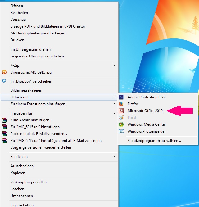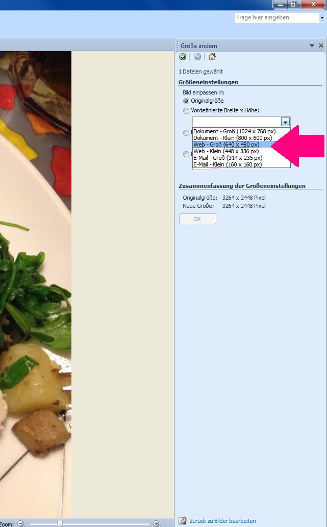 Das funktioniert auch bei Windows 7. Allerdings sind bei mir dann die Bilder häufig trotzdem noch zu groß. Es kommt immer drauf an, womit ich sie aufgenommen habe. Man kann natürlich die Pixelzahlen einfach runterschrauben. Da müsst ihr dann einfach mal testen.Falls ihr noch Fragen habt (vielleicht eine andere Office-Version o. ä.) oder ihr es trotzdem nicht hinbekommt, schickt mir eine PN. Ich kümmer mich dann drum.