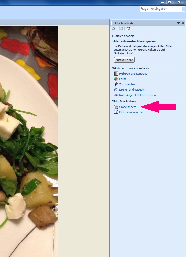 1. Ihr öffnet das Foto mit dem Picture Manager (Rechtsklick auf das Bild, Öffnen mit …, Microsoft Office 2010). Bild 12. Ihr klickt auf „Bilder bearbeiten“. Dann öffnen sich rechts am Rand die Bearbeitungsmöglichkeiten. Dort klickt ihr auf „Größe ändern“ und erhaltet dann die Größeneinstellungen. Bilder 2 und 3