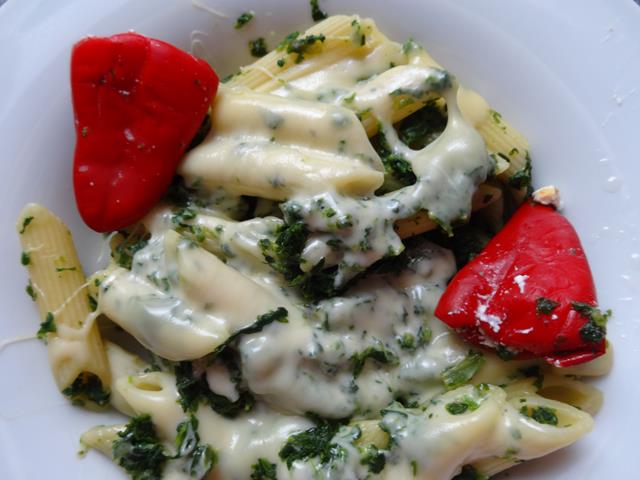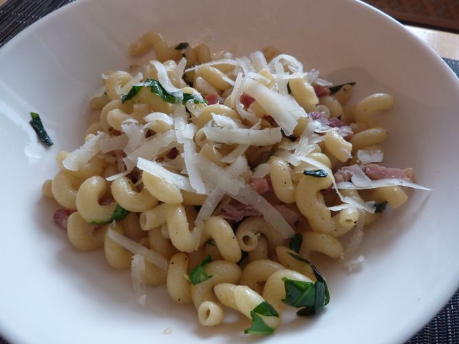 Hörnchennudeln mit Speckpesto (S.29)