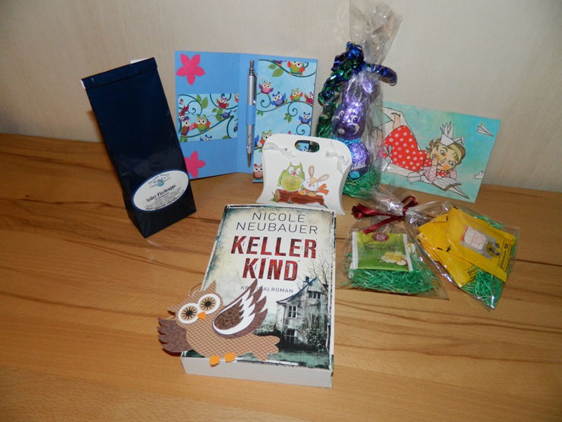 Ich hab natürlich wieder vergessen es noch eingepackt zu fotografieren... es war ein süßer kleiner Prinz-Karton und in total niedliches Eulen-Papier verpackt (Das sieht man wenigstens im Hintergrund).Drin waren gaaaanz viel Schoki, Kekse und Gummibärchen