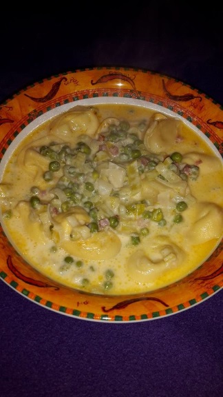 Wie Jasmin habe ich die Pilze ebenfalls weggelassen, da ich die nicht mag. Statt dessen habe ich mehr Lauch und Erbsen verwendet. Die Tortellini - die aus dem Kühlregal, die man ohnehin nur 2 min kochen soll - habe ich einfach so zugegeben, also nicht extra vorgekocht. Hat gut gepasst.