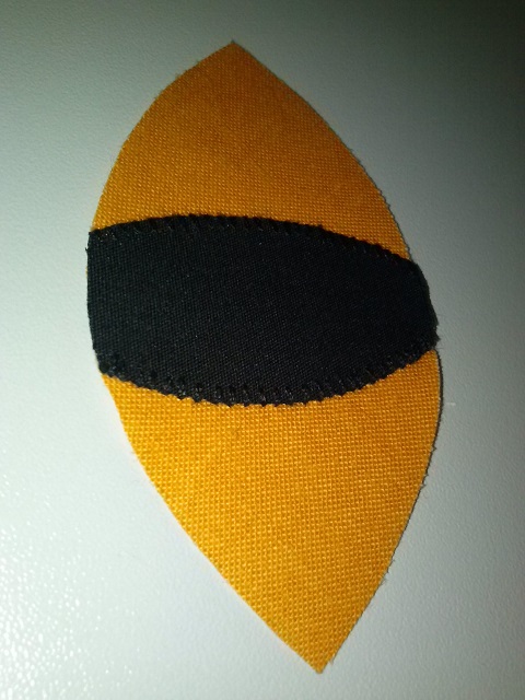 Eine Pupille ist auch schon angenäht am Auge. Ich habe es wegen der Naht extra abfotografiert. (Schwarz auf Schwarz ist aber so ne Sache) Mit dem Appliziervlies verstärkt lässt sich das wunderbar mit der Hand nähen. Aber es dauert.
