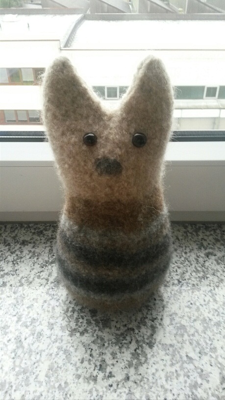 Da ich noch nie gefilzt habe, ist diese Premiere eine spannende Sache für mich. Zur Zeit trocknet der Korb in der Sonne. Er sieht gut aus, jetzt müssen nur noch die Katzen ihn annehmen. Wir haben zur Zeit auch noch 2 Besuchskatzen. Irgendwer wird ihn schon mögen