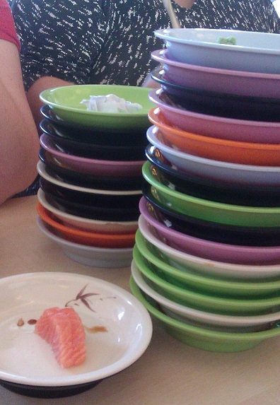 Wie man sieht, bauen die verfressenen Frankeneulen nicht nur beim Running Sushi Tellertürmchen, sondern auch beim Tapasfuttern... ![]()