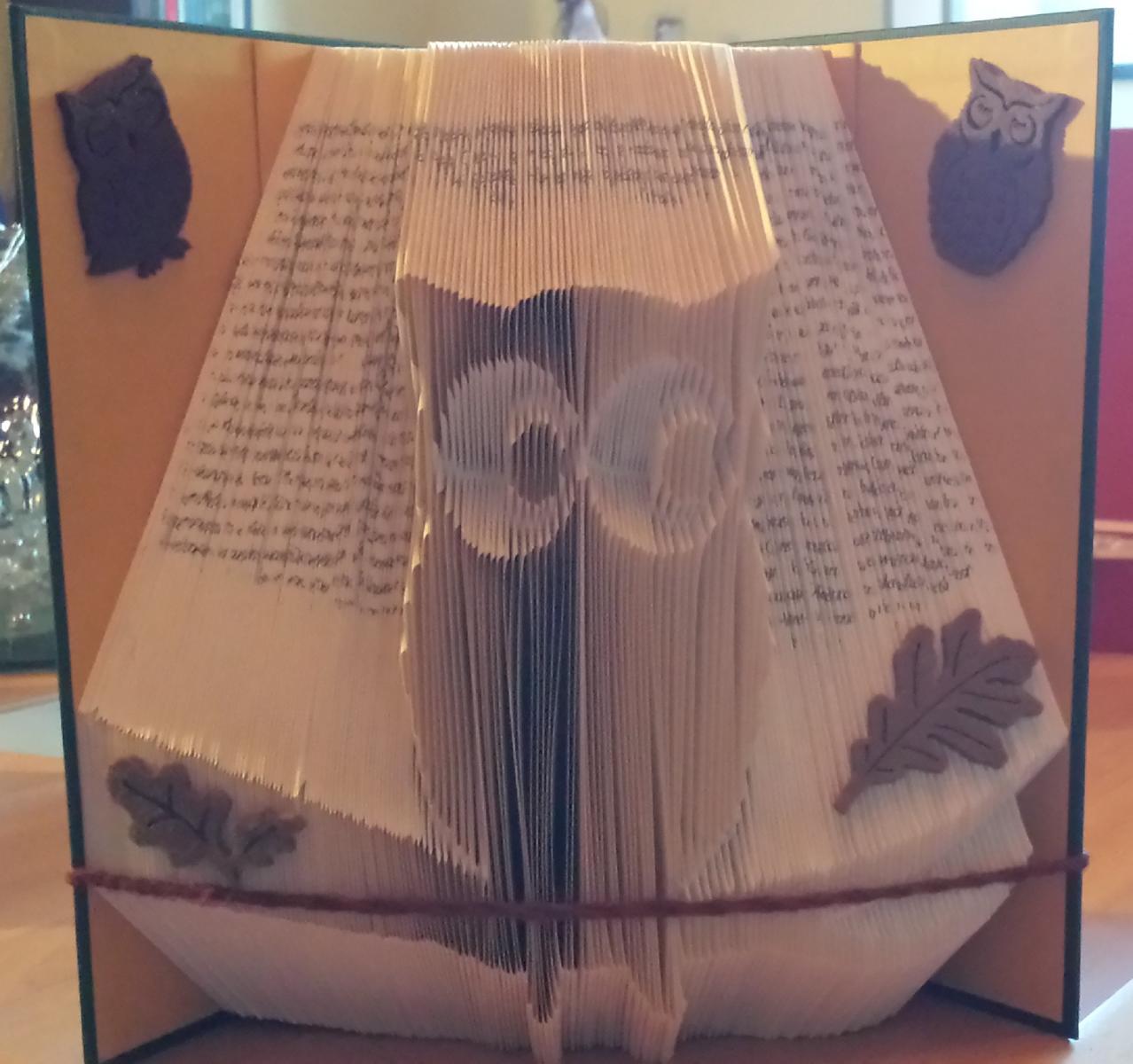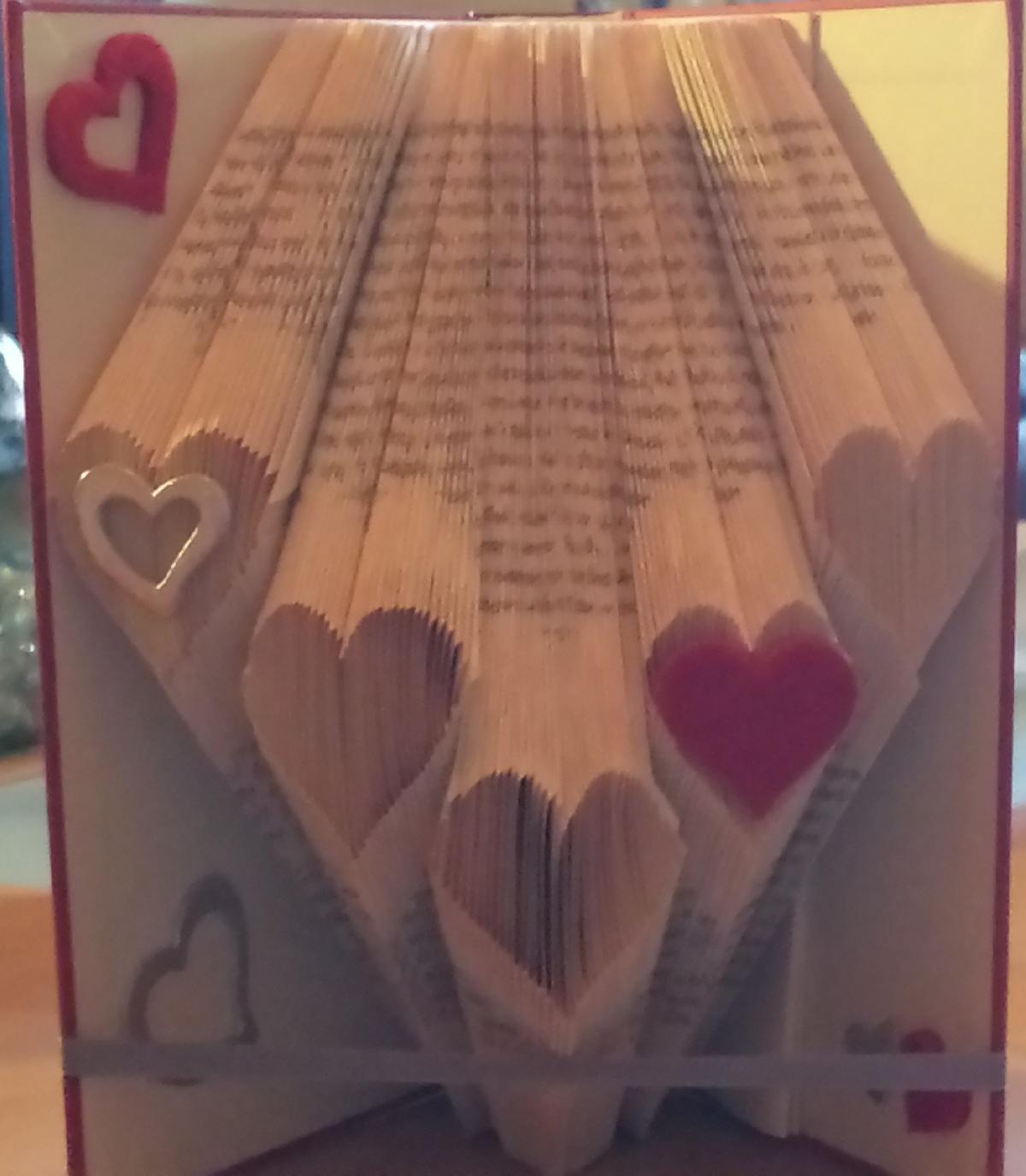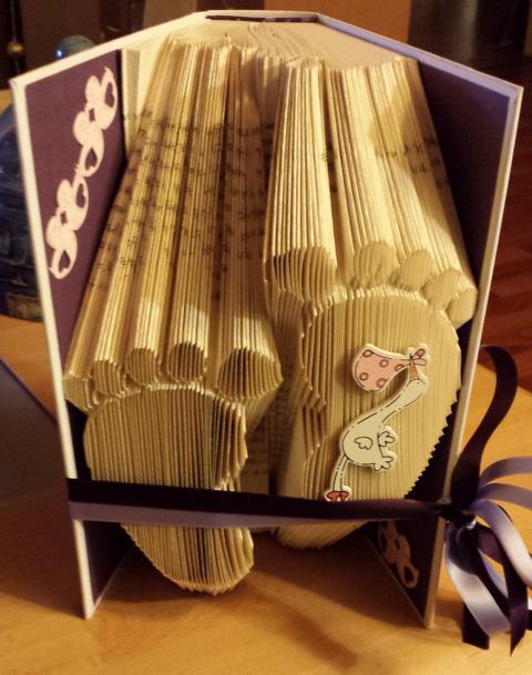 Für alle, die jetzt aufschreien, oh, wie kann man Büchern so was antun :cry, ich verfalte gebrauchte Bücher oder auch Bücher, die mir nicht so gut gefallen haben und die ich aus Platzgründen (über 3000 Bücher) einfach nicht mehr stellen kann. Es ist ein schönes Geschenk für Bücherfreunde und wertet ein Regal noch mal so richtig schön auf ![]()