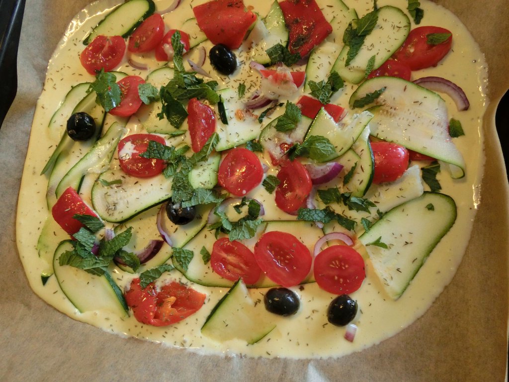 Mit dem Belag kann man ja variieren, ich hatte Zucchini, Tomaten, schwarze Oliven, rote Zwiebeln, gegrillte rote Paprika, frische Minze und Thymian verwendet.