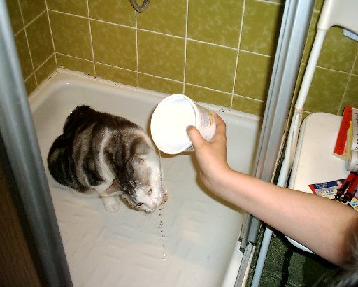 • Ich habe diverse Behälter mit Wasser herum stehen, weil Katze ihren Wassernapf auch gern ignoriert, d.h. eine Schale mit Schwimmkerze und ein Milchtopf, umfunktioniert als Gießkanne.