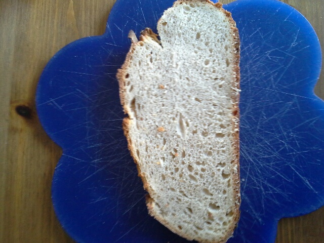 Ich habe allerdings nur 450 g Wasser, 500 g Mehl 550er und 200 Roggenmehl 1150er genommen, außerdem noch 1/2 TL Brotgewürz dazu gegeben. Der Teig war ziemlich klebrig, aber das Ergebnis schmeckt sehr lecker.