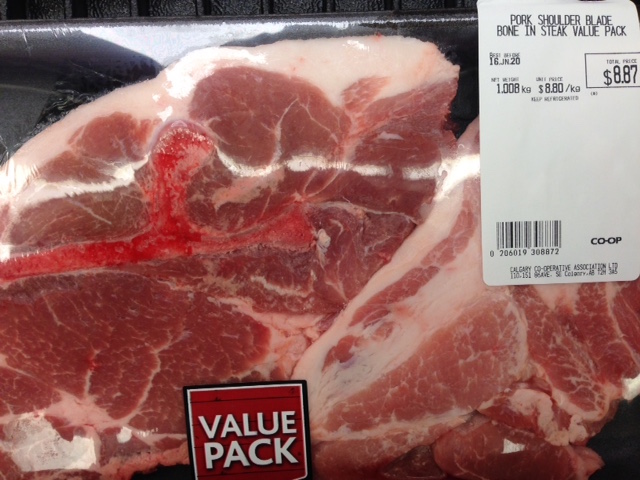 So hier erstmal die Fotos zum Vergleich mit dem Schweineschultersteak (pork shoulder blade), was m.M. schon wie ein Schweinenackensteak aussieht, und der sehr mageren Lende (pork loin). Gekauft hab ich in diesem Fall das billigere ![]()