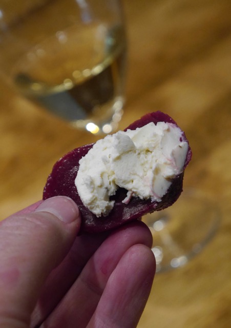 Weil meine Familie nicht so heiss auf rote Beete ist, hab ich nicht ganz soooo viel in den Salat rein gemacht und statt dessen mir ein paar Scheiben davon mit Ziegenkäse belegt als Appetithappen während des Kochens einverleibt. Super lecker !!!!! Nicht nur wegen des Glases Weins dabei - schliesslich ist Freitag Abend ![]()