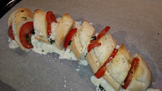 Zudem habe ich das Baguette ein wenig zu lange im Ofen gelassen, war gerade abgelenkt, daher ist mein Mozzarella ein wenig zu sehr verlaufen.