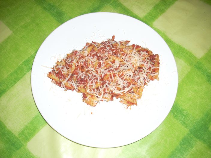 Da ich keine Kapern mag, habe ich sie weggelassen und dafür aus dem Tipp die Chili hinzugefügt. Statt frischem Rosmarin musste es getrockneter tun, und eine andere Nudelsorte war es auch. Das Ergebnis war aber durchaus lecker, v.a. mit viel frisch geriebenem Parmesan dazu.