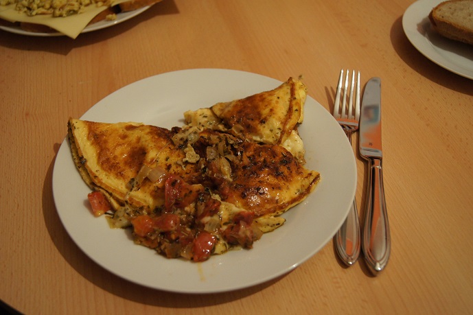 Da ich für keines der Rezepte alle Zutaten im Haus hatte, bin ich bei der Füllung der Omelettes etwas kreativ geworden und habe Tomaten angebraten und das Omelette dann mit Tomaten und Gouda gefüllt. Zudem habe ich die Sahne durch Milch ersetzt.