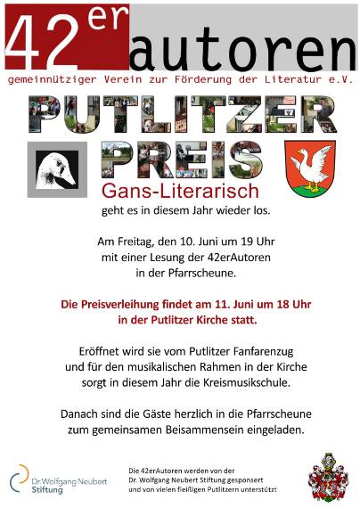 Nur noch wenige Tage, dann wird der diesjährige Putlitzer Preis der 42erAutoren im kleinen brandenburgischen Städtchen Putlitz vergeben. Besonders für die Lesungen am Freitag sind Eulen als Gäste ganz besonders herzlich willkommen! Der Besuch lohnt sich!