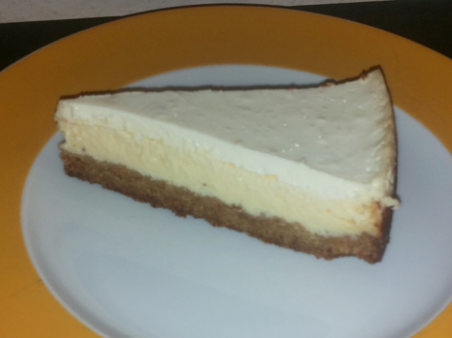Vor ein paar Tagen habe ich nochmal den New York Cheesecake gebacken. Dieses Mal in der richtigen Form mit 23 cm Durchmesser. Dadurch waren die Schichten dicker als mit der größeren Form und dadurch war die Backzeit jeweils länger als angegeben.