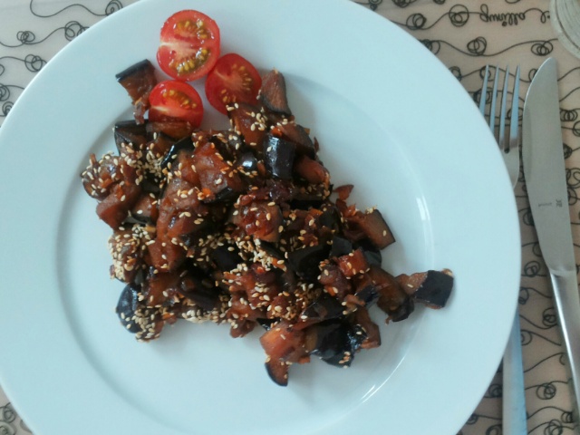 • Heute wollte ich eigentlich die karamellisierten Auberginen machen, aber dafür haben mir dann doch ein paar Zutaten zuviel gefehlt. Immerhin hatte ich Auberginen. :lache