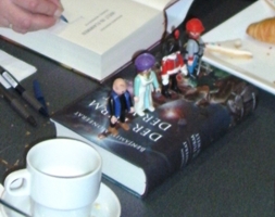Er begann mit dem, was vermutlich alle Anwesenden wußten, nämlich daß Benjamin Monferat ein Pseudonym und sein eigentlicher Name Stephan Rother ist. Damit die Erzählung etwas anschaulicher wurde, hatte er einige, manchen vielleicht von seiner Facebook-Seite her bekannte, puppenartige Figuren mitgebracht, so daß aus dem zwei- ein dreidimensionaler Vortrag wurde. Kurzweilig, wie man ihn aus Leserunden oder seinen Youtube-Filmen her kennt, plauderte er über das Buch, manche der Verwicklungen darin oder über die Veränderungen, die die eine oder andere Figur während des Schreibens erfahren hatte. Da nicht alle Teilnehmer das Buch schon gelesen hatten, mußte natürlich darauf geachtet werden, wichtige Vorkommnisse nicht zu spoilern - eine Vorgabe, die Monferat alias Rother glänzend meisterte, indem er zum Beispiel bisweilen mehrere Möglichkeiten ansprach und offen ließ, welche denn nun die zutreffende ist. Hätte ich das Buch nicht schon gelesen - spätestens jetzt würde ich es umgehend lesen wollen.