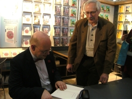 Viel zu schnell verging die Zeit und es hieß, sich wieder zu verabschieden. Rowohlt/Wunderlich hatte jedoch für jeden Teilnehmer eine Tüte vorbereitet, in der unter anderem ein Exemplar vom „Turm der Welt“ enthalten war. Keine Frage, daß der Tisch abgeräumt und der Autor zum Signieren gebeten wurde, was er auch mit inzwischen schon gewohnter launischer Fröhlichkeit tat. Solchermaßen beschenkt und gestärkt konnte dann der Weg durch die Hallen fortgesetzt werden.