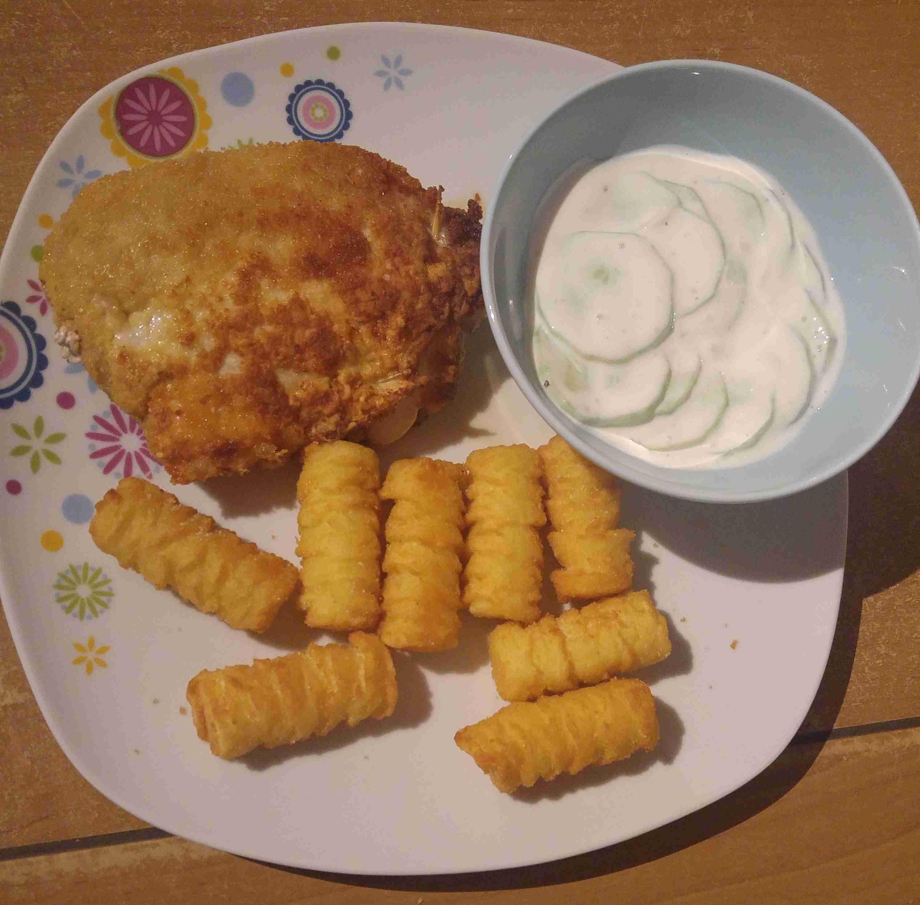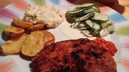 Wir hatten heute zum Abendbrot das Cordon Bleu (Seite 231) und Gurkensalat mit Sauerrahmdressing (Seite 45). Den Kids und uns hat es sehr gemundet...