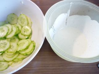 Heute habe ich den Gurkensalat mit Sauerrahmdressing gemacht. So ähnlich mache ich ihn eigentlich meistens, wobei ich nur einweiche und nicht noch ausdrücke. Wir mögen den Salat ganz gerne ein bisschen suppig. Ich habe ins Dressing kein Salz mehr extra gegeben, weil ich finde, dass an den Gurken vom Ziehen genug Salz haften bleibt.