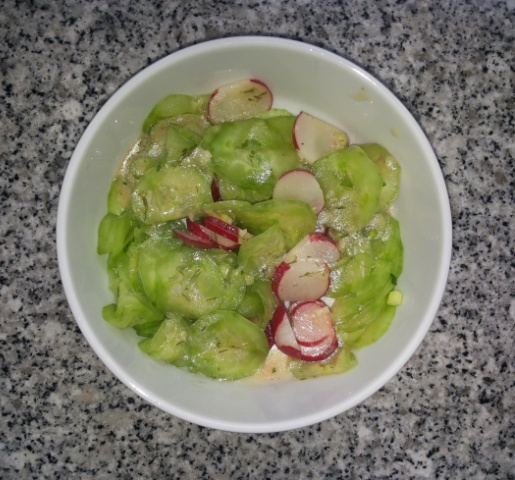 Ich habe heute diverse Reste und Kleinmengen verarbeitet, unter anderem gab es die Kräuterseitlinge (wie immer sehr lecker) als Beilage ... und eben den Gurkensalat mit Essig und Öl.
