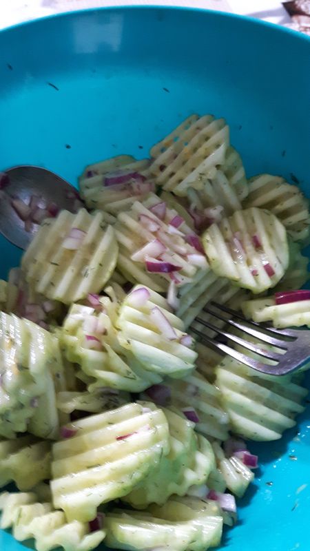 Heute habe ich den Gurkensalat mit Sauerrahmdressing gemacht. So ähnlich mache ich ihn eigentlich meistens, wobei ich nur einweiche und nicht noch ausdrücke. Wir mögen den Salat ganz gerne ein bisschen suppig. Ich habe ins Dressing kein Salz mehr extra gegeben, weil ich finde, dass an den Gurken vom Ziehen genug Salz haften bleibt.Finde ich auch, habe bisher kein Salz an die Gurken gegeben und es war noch genug zu schmecken. Nachsalzen kann man, wer mag, immer noch.