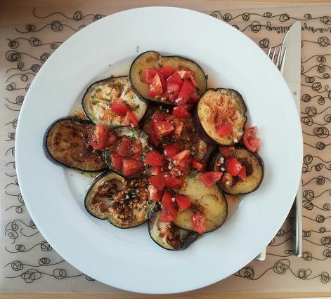 Auberginen, gebraten mit Tomaten-Vinaigrette, S. 68