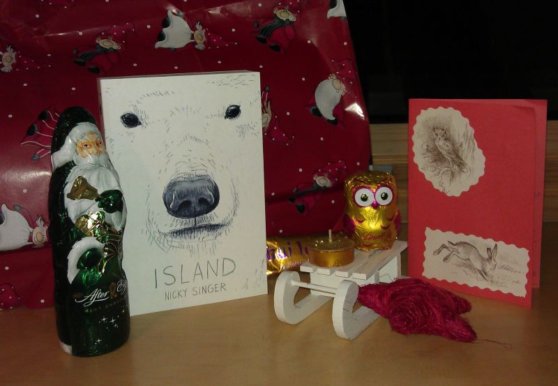 • Als ich mein Päckchen aufgemacht habe, kam mir gleich ein unglaublich guter Geruch entgegen, der mich neugierig gemacht hat. ;-) Als zweites fiel mir die schöne Karte mit den hübschen Zeichnungen von einer Eule und einem Hasen auf. :-) Als Drittes ein weihnachtlich eingepacktes Buch und die Quelle des verlockenden Geruchs: ein etwas zerdrückter After Eight Weihnachtsmann, wodurch alles ganz schokoladig-minzig gerochen hat, hmmm. :heisseliebe Weil er kaputt war, hatte ich eine super Ausrede ihn gleich anzubrechen. ;-) :-]