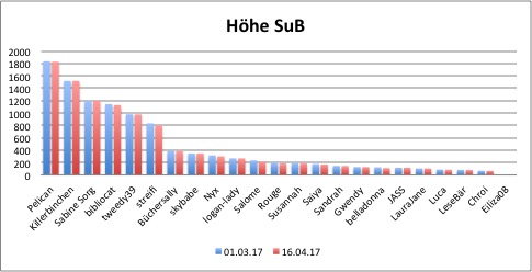 Insgesamt betrug von 23 Eulen der Stapel am 1. März 2017 10487 ungelesene Bücher. Davon wurden 199 gelesen und 64 Neuzugänge wurden verzeichnet. Der SuB am 16. April 2017 betrug demnach 10.352.